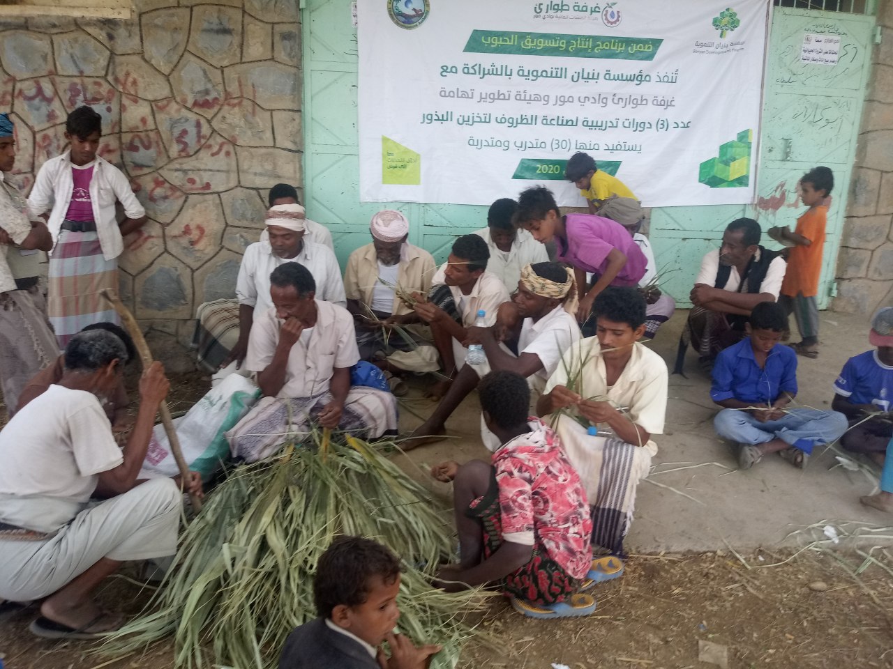 الصمود/اختتمت مؤسسة بنيان التنموية بمحافظة الحديدة ،اليوم ، ثلاث دورات تدريبية في مجال صناعة الظروف في الشريط الساحلي .حيث تم تنفيذ دورة تدريبية لعدد 16 مشاركا من أبناء منطقة البجيلة ودورتين لعدد 31 مشاركة من نساء منطقة دير النهاري.وفي الاختتام أكد ضابط المشروع المهندس محمد أبو طالب على اهمية هذه الدورة التي تأتي في إطار مشروع زيادة انتاجية الحبوب في الشريط الساحلي، مشيراً إلى أن الدورات التي استمرت لمدة عشرة أيام هدفت إلى احياء الصناعات المحلية المرتبطة بالجانب الزراعي.وبيّن أنه تم اكساب المشاركين خبرات ومعارف حول صناعة الظروف لتخزين التقاوي (الحبوب) في الشريط الساحلي والتي تتناسب مع مناخ وظروف المنطقة التهامية من حيث الحرارة و الرطوبة .من جانبهم أشار المتدربون إلى أهمية الدورات ومدى استفادتهم منها واكتسابهم خبرات كافية وبما يؤدي إلى توفيرها في الأسواق ليستفيد منها المزارعون، داعين الجهات ذات العلاقة للتعاون معهم و دعمهم بتوفير المواد الخام حتى يتمكونوا من الاعتماد على أنفسهم .وناشدوا الدولة بتشجيع زراعة أشجار نخيل الدوم والأنواع الأخرى من النخيل التي تعتبر مواد خام لكثير من الصناعات الحرفية، كالظروف والحصير و الموائد والسجاجيد وكذا الظلال (الكوافي) بجميع انواعها،لافتين إلى أنها ستساهم في تحسين مستواهم المعيشي من خلال أسعارها الجيدة التي قد يصل سعر الظلة الواحدة منها لأكثر من خمسة عشر الف ريال.