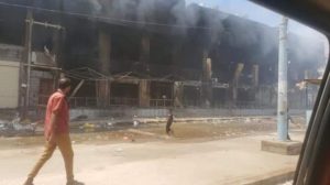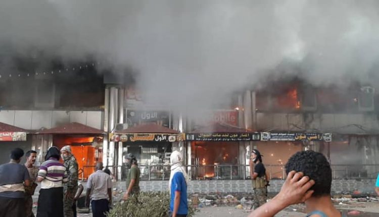حيث افادت مصادر محلية عن اندلع حريق وسط المركز الذي يقع بحي الممدارة والتهم عشرات المحال التجارية.