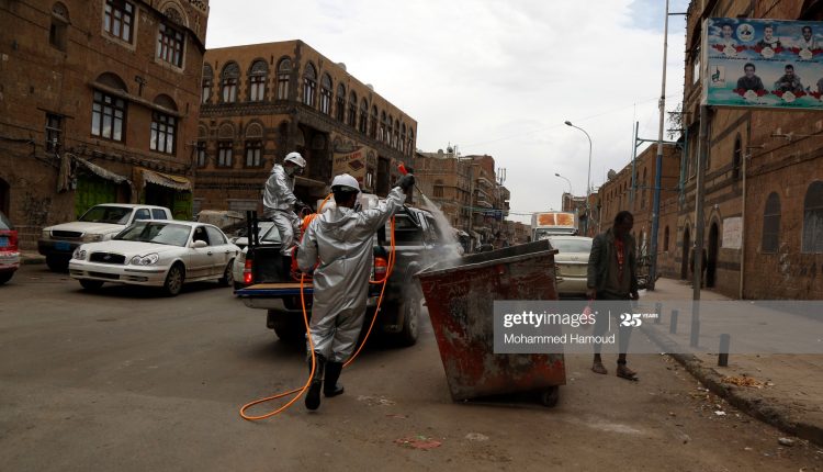 SANA'A, YEMEN - APRIL 28: A health member wearing a protective uniform sprays disinfectants to help fight the spread of the coronavirus on April 28, 2020 in Sana'a, Yemen.The first case of infection with the coronavirus in Yemen was reported on April 10. (Photo by Mohammed Hamoud/Getty Images)