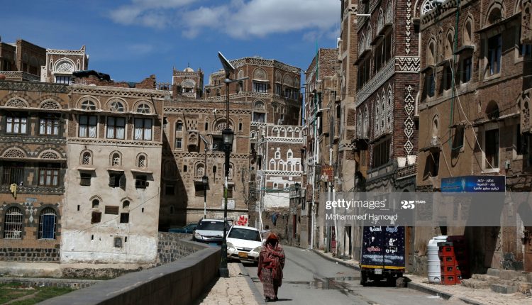 SANA'A, YEMEN - MAY 07: A woman with traditional dress walks by historic buildings in the quarter of Sana'a amid fears of the spread of coronavirus COVID-19 while they shop during the month of Ramadan on May 07, 2020 in Sana'a, Yemen. (Photo by Mohammed Hamoud/Getty Images)