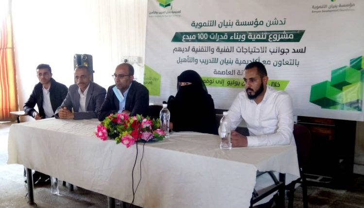 دُشن اليوم بأكاديمية بنيان للتدريب والتأهيل بصنعاء مشروع تنمية وبناء قدرات الشباب المبدعين والمبتكرين في الجوانب الفنية والتقنية، والذي تنظمه مؤسسة بنيان التنموية .