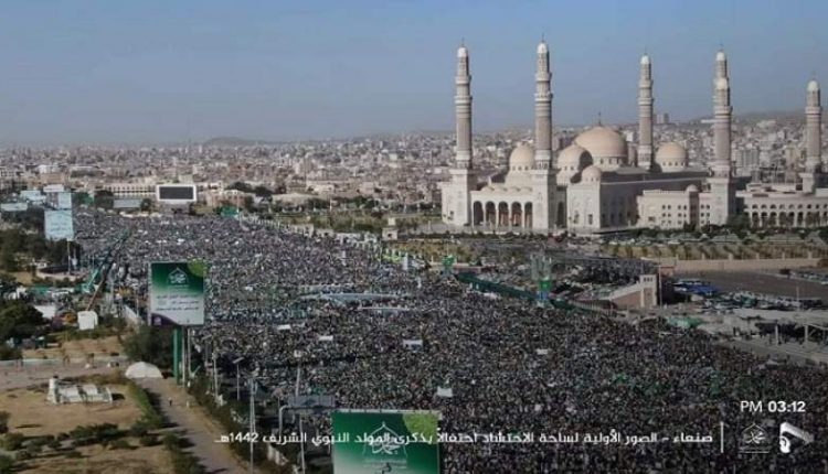 شهدت العاصمة صنعاء عصر اليوم الخميس، حشدا جماهيريا غير مسبوق في ساحة ميدان السبعين والشوارع المجاورة والمؤدية إليها، احتفاء بذكرى المولد النبوي الشريف.