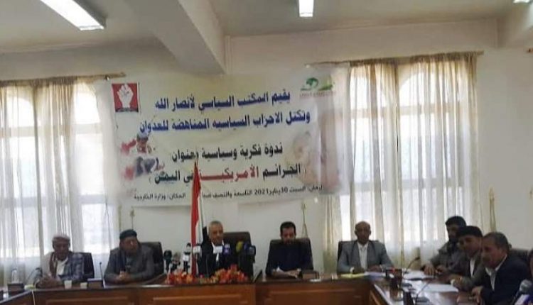 صنعاء | الصمود | عٌقدت بصنعاء اليوم السبت، ندوة سياسية بعنوان الجرائم الأمريكية في اليمن، نظمها المكتب السياسي لأنصار الله وتكتل الأحزاب السياسية المناهضة للعدوان.