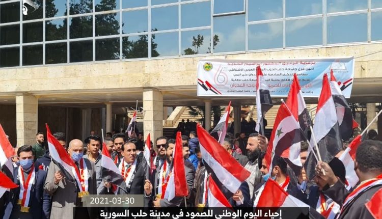 سوريا | الصمود | أقيمت اليوم الثلاثاء ، بمدينة حلب السورية فعاليات خطابية بمناسبة الذكرى السادسة للصمود في وجه العدوان الأمريكي الصهيوني السعودي الاماراتي الغاشم وتدشين العام السابع لمواجهة مخططات الاحتلال والتصدي لمساعي فرض الوصاية على اليمن.