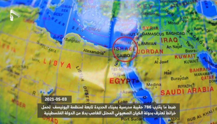 | الصمود | ضبطت الأجهزة الأمنية بميناء الحديدة 786 حقيبة مدرسية تحمل خرائط تعترف بالكيان الصهيوني بدلا عن دولة فلسطين، تتبع منظمة اليونيسف كانت تريد توزيعها على طلاب وطالبات محافظة الحديدة.