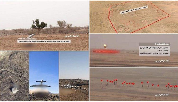 وزع الإعلام الحربي اليوم الخميس، مشاهد نوعية للعملية العسكرية الواسعة التي استهدفت معسكر تدريب تابع لتحالف العدوان في منطقة الوديعة بعشر طائرات مسيرة نوع قاصف 2K.