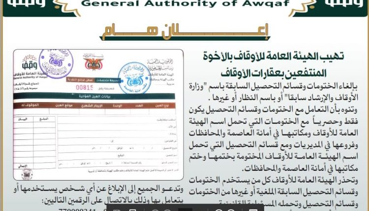 وتنوه إلى أن التعامل يكون فقط وحصرياً مع الختومات وقسائم التحصيل التي تحمل اسمَ وختمَ الهيئة العامة للأوقاف ومكاتبها بأمانة العاصمة أو المحافظات وفروعها بالمديريات.