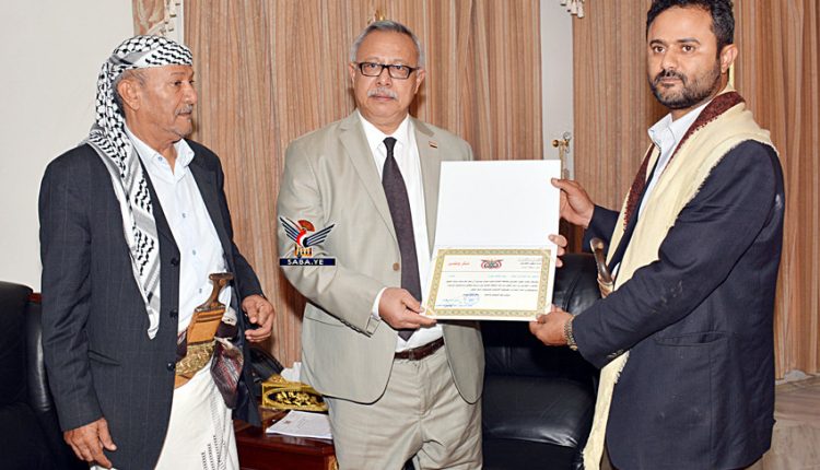 جاء ذلك خلال لقاء رئيس الوزراء، اليوم، وكيل محافظة الضالع حسين واصل، الذي سلمه شهادة تقديرية من المغتربين من أبناء الضالع في أمريكا وذلك تقديراً منهم لدور رئيس الوزراء في رعاية قضايا المغتربين في الداخل ومتابعته المستمرة وتشجيعه لمبادراتهم المجتمعية الإنسانية والتنموية داخل الوطن .