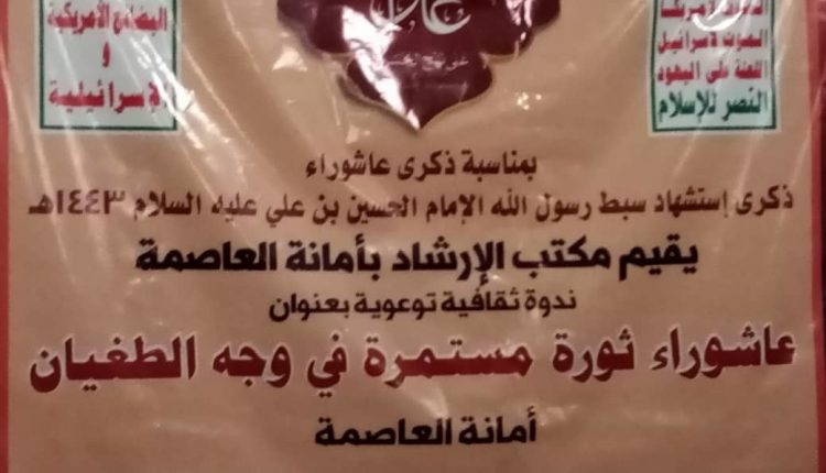 نظم مكتب الإرشاد بأمانة العاصمة اليوم فعالية ثقافية بمديرية بني الحارث بذكرى استشهاد الإمام الحسين عليه السلام تحت شعار ” عاشوراء ثورة مستمرة في وجه الطغيان”.