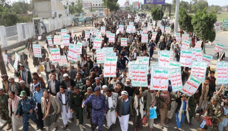 وردد المشاركون في المسيرة التي شارك فيها المحافظ محمد البخيتي وعضو مجلس الشورى حسن عبدالرزاق ووكيلا المحافظة محمد عبدالرزاق ومحمود الجبين وأعضاء السلطة المحلية والمكتب التنفيذي والإشرافي، هتافات رافضة للهيمنة الأمريكية الصهيونية.
