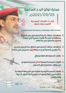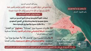 وأكد سريع أن العملية استهدفت منشآت تابعة لشركة أرامكو في (رأس التنورة) بمنطقة الدمام شرقي السعودية بثمان طائرات مسيرة نوع “صماد3” وصاروخ باليستي نوع (ذو الفقار) ، إلى جانب قصف منشآت أرامكو في مناطق جدة و جيزان ونجران بخمسة صواريخ باليستية نوع بدر وطائرتين مسيرتي نوع “صماد3” .. لافتاً إلى أن العملية حققت أهدافها بنجاح.