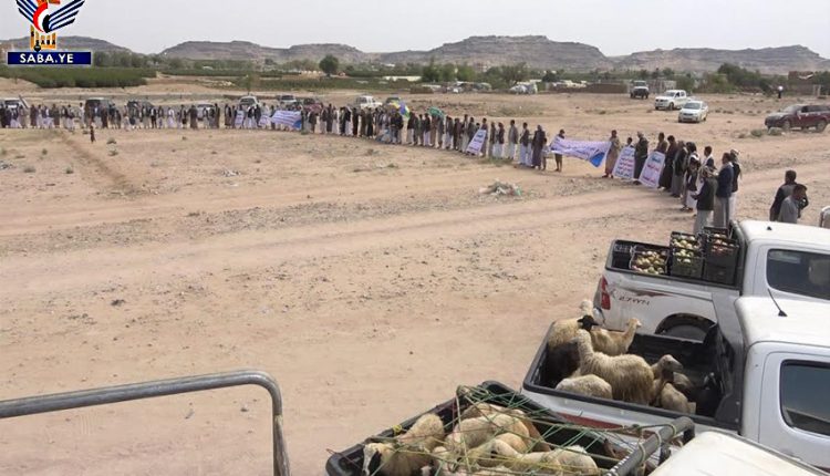 ودعا أبناء المديرية، القوة الصاروخية والطيران المسير لتنفيذ مزيد من الضربات في العمق السعودي حتى يتوقف العدوان ويرفع الحصار المفروض على الشعب اليمني.
