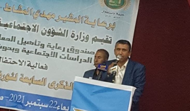 وفي الفعالية، بحضور وزير الدولة الدكتور حميد المزجاجي، أفاد وكيل وزارة الشؤون الاجتماعية لقطاع التنمية الاجتماعية، يحيى قرواش، بأن ثورة 21 سبتمبر تمثل نتيجة طبيعية لما كانت عليه أوضاع البلاد من الارتهان للقوى الخارجية، وتحول قياداتها إلى مجرد أدوات تنفيذية لمخططات تمزيق النسيج الاجتماعي لأبناء اليمن.