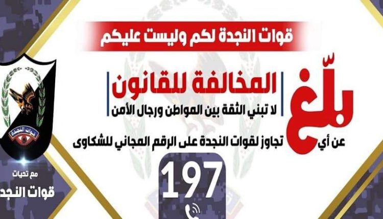 أعلنت قوات النجدة، عن بدء استقبال شكاوى المواطنين عن أي تجاوز لمنتسبي قوات النجدة على الرقم المجاني (197).