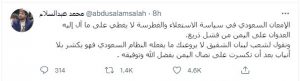 وخاطب محمد عبد السلام في تغريدته على تويتر، الشعب اللبناني قائلًا : “لا يروّعنك ما يفعله النظام السعودي فهو يكشر بلا أنياب بعد أن تكسّرت على نصال اليمن بفضل الله وتوفيقه”.