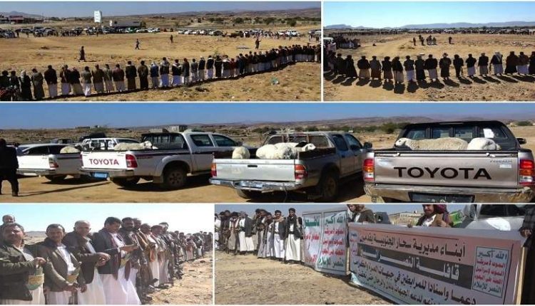 وخلال تسيير القافلة التي احتوت على مواشي ومبالغ مالية، نظم أبناء المربع الجنوبي وقفة احتجاجية للتنديد باستمرار العدوان والحصار وإعلان النفير العام والتحشيد للجبهات لمواجهة قوى العدوان والمرتزقة.