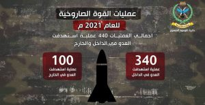 القوة الصاروخية هي الأخرى حيث شاركت بقوة في عمليات 2021 م وتمكنت من 440 عملية استهدفت من خلالها الوحدة أهدافاً تابعة للعدو داخل اليمن وتحديداً في المناطق المحتلة وكذلك خارج اليمن. . مضيفا أن اجمالي العمليات التي استهدفت مواقع وتجمعات ومعسكرات العدو داخل اليمن بلغت 340 عملية ، فيما تم تنفيذ 100 عملية استهدفت تجمعات ومنشآت العدو خارج اليمن.