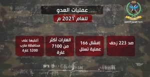 وأوضح أن المحاولات الهجومية للعدو لم توقف من خلال مرتزقته اليمنيين والأجانب وكذلك قواته فقد تصدت قواتنا خلال العام 2021م لـ 223 محاولة هجومية وأفشلت بعون الله 166 محاولة تسلل .