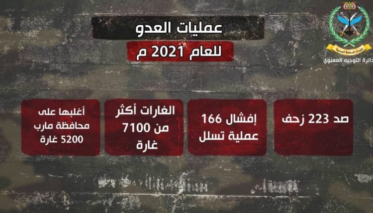 وأكد أن تحالف العدوان شن خلال العام 2021م 7100 غارة جوية استهدفت عدة مناطق وأدت الى وقوع شهداء وجرحى إضافة الى نتائج تلك الغارات على البنية التحتية وممتلكات المواطنين,, موضحا أن الجزء الأكبر من هذه الغارات استهدف مناطق مختلفة من محافظة مارب .
