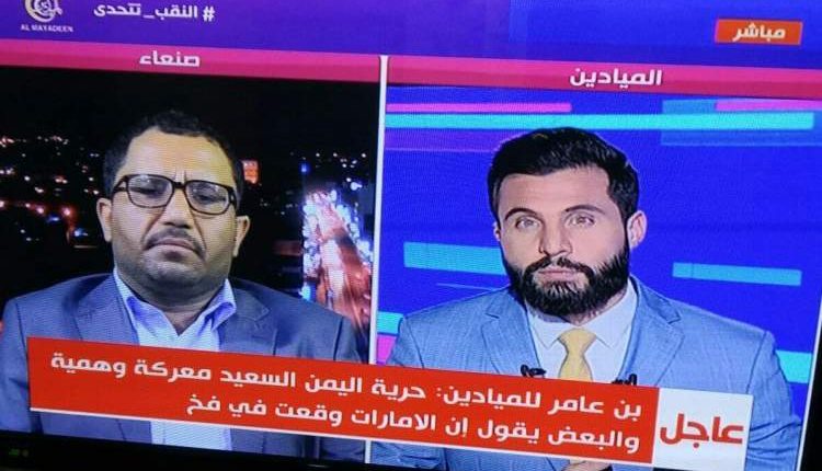 ورداً على سؤال المذيع حول ما تطلبه القيادة اليمنية من الإمارات أشار بن عامر، إلى أن ترفع يدها عن اليمن وعدم التدخل في شؤونه لأنها دولة معادية محتلة وأن روجوا لعمليات تحمل أسماء رنانة مثل اليمن السعيد.