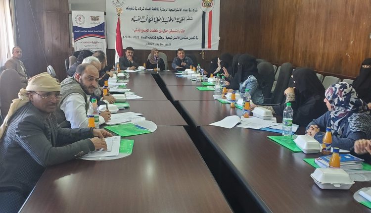 نظمت الهيئة الوطنية العليا لمكافحة الفساد اليوم لقاءً تنسيقياً حول دور منظمات المجتمع المدني في تفعيل وتنفيذ مضامين الاستراتيجية الوطنية لمكافحة الفساد 2022 – 2026م.