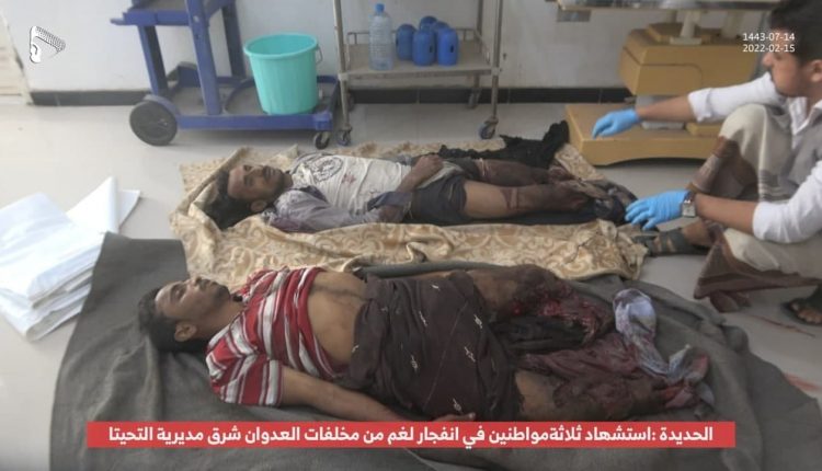 اُستشهد ثلاثة مواطنين، اليوم الثلاثاء، جراء انفجار لغم من مخلفات العدوان الأمريكي- السعودي- الإماراتي في محافظة الحديدة.