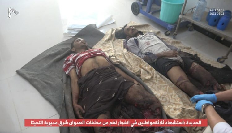 شهداء بانفجار لغم من مخلفات العدان في التحيتا بالحديدة On فبراير 16, 2022 الصمود | استشهد ثلاثة مواطنين، امس الثلاثاء ، إثر انفجار لغم من مخلفات العدوان الأمريكي السعودي الإماراتي في مديرية التحيتا بمحافظة الحديدة. مصدر أمني أكد استشهاد ثلاثة مواطنين جراء انفجار لغم من مخلفات العدوان الأمريكي السعودي الإماراتي شرق مديرية التحيتا بمحافظة الحديدة وهم 1_محمد أحمد عبدالله بلكم..22عاما 2_خالد محمد عبدالله بلكم..27عاما 3_سعيد محمد عبدالله بلكم.. 32عاما مشاركة