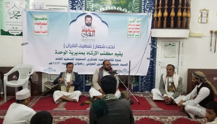 الصمود | نظّٙمت مديرية الوحدة بأمانة العاصمة اليوم، فعالية ثقافية بذكرى سنوية الشهيد القائد حسين بدر الدين الحوثي تحت شعار “شهيد القرآن”.