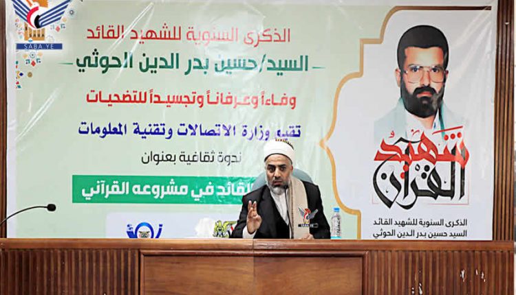 وفي الفعالية التي أقيمت بالوحدة التنفيذية للإنشاءات والمشاريع بحضور وزير الاتصالات وتقنية المعلومات المهندس مسفر النمير والعاملين بالوحدة، استعرض عضو المكتب الثقافي لأنصار الله يحيى أبو عواضة، جانباً من حياة الشهيد القائد ومآثره التي تجلّت في الدفاع عن الأمة وإنقاذها بإحياء ثقافة القرآن الكريم.