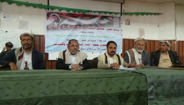 من جهته أكد مدير المديرية راجح الحنمي، جاهزية واستعداد أبناء مديرية بني حشيش على تعزيز دورها في الحشد ورفد الجبهات وترجمة أهداف حملة اعصار اليمن، التي تمثل انتصارا جديدا للحمة اليمنية في مواجهة العدوان..