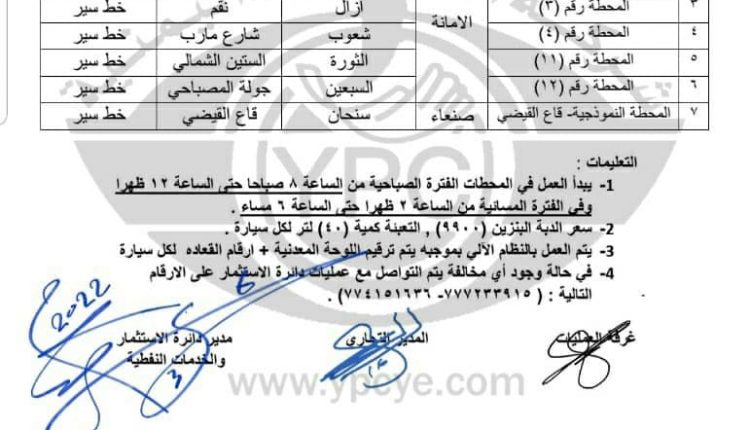 كشف باسماء المحطات التجارية العاملة بالسعر التجاري لمادة البنزين في محافظة صنعاء وعمران والمحويت ليوم الإثنين 07 مارس 2022م.