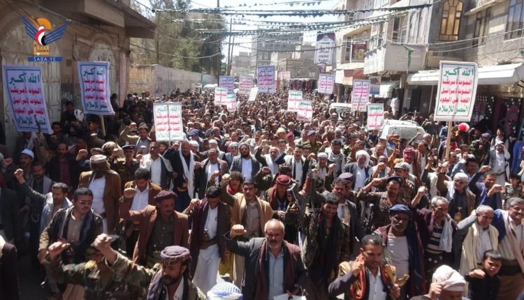 وأكد بيان صادر عن المسيرة تلاه وكيل المحافظة عباس العمدي، أن العدوان على اليمن أمريكي يستهدف كافة أبناء الشعب اليمني ومواجهته واجب من خلال النفير العام للجبهات.