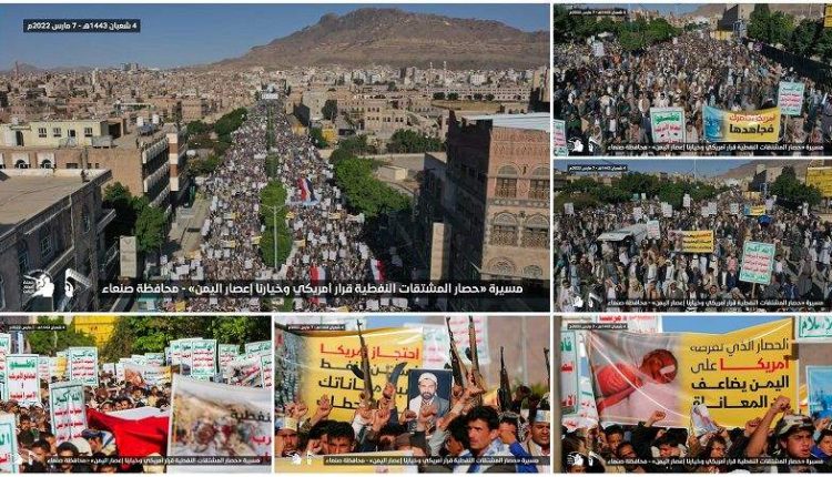 شهدت العاصمة صنعاء، عصر اليوم، مسيرة جماهيرية حاشدة في ساحة “باب اليمن” للتنديد بحصار المشتقات النفطية، تحت شعار “حصار المشتقات النفطية قرار أمريكي وخيارنا إعصار اليمن”.