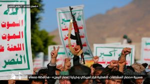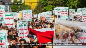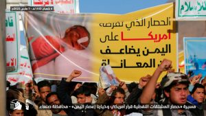 ورفعت الحشود الجماهيرية في المسيرة لافتات منددة بتشديد دول تحالف العدوان بقيادة أمريكا للحصار الاقتصادي على الشعب اليمني واحتجاز سفن المشتقات النفطية.