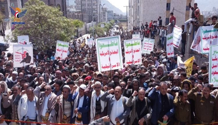 وردد المشاركون الهتافات المنددة بالحصار الأمريكي واحتجاز سفن المشتقات النفطية ومنع دخولها إلى ميناء الحديدة رغم حصولها على تصاريح أممية.