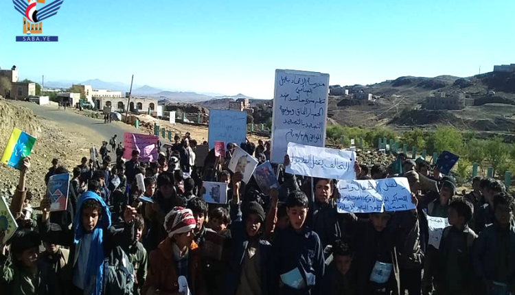 مسيرة طلابية في الحيمة الداخلية بصنعاء تندد بحصار تحالف العدوان الأمريكي