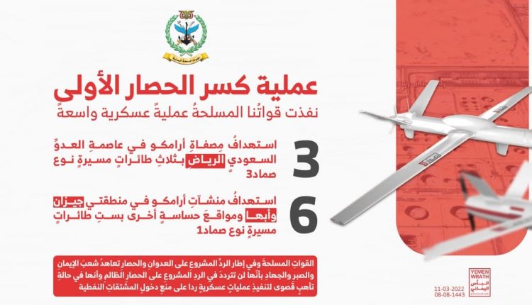 وأوضح المتحدث الرسمي للقوات المسلحة العميد يحيى سريع في بيان تلقت وكالة الأنباء اليمنية (سبأ) نسخة منه أن القوات المسلحة نفذت عملية عسكرية بتسع طائرات مسيرة، استهدفت مِصفاةِ أرامكو بعاصمةِ العدوِّ السعوديٍ الرياضِ بثلاثِ طائراتٍ مسيرةٍ نوع صماد٣، ومنشآتِ أرامكو في منطقتي جيزان وأبها ومواقعَ حساسةٍ أخرى بستِ طائراتٍ مسيرةٍ نوع صماد1.
