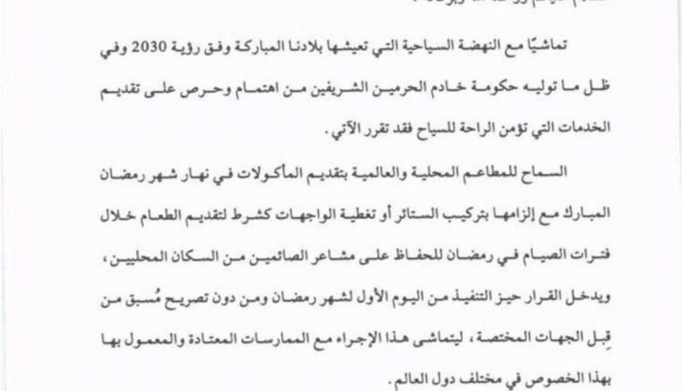 عاجل.. السعودية تسمح بالإفطار نهار رمضان وتصدر تعميم لجميع المطاعم داخل المملكة (وثيقة)