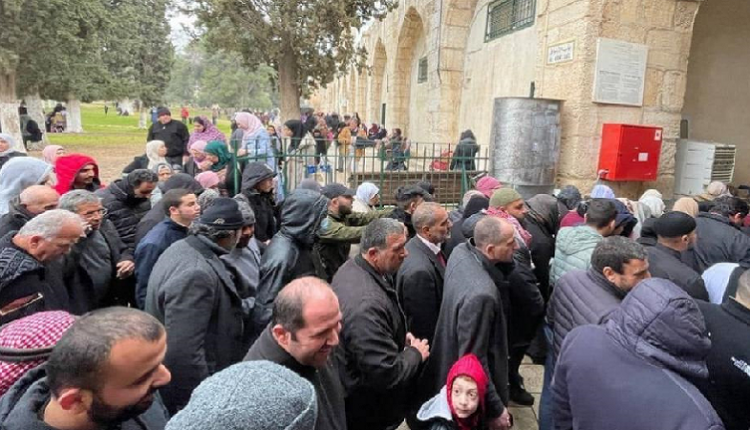 واحتشد آلاف المصلين في ساحات المسجد الأقصى المبارك بالرغم من إجراءات العدو وحالة البرد الشديد وأدوا صلاة الجمعة.