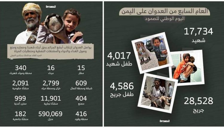 وثق مركز عين الإنسانية للحقوق والتنمية استشهاد وإصابة 46,262 مدني بينهم قرابة 14 ألف امرأة وطفل جراء القصف المباشر للعدوان الأمريكي السعودي على اليمن طيلة 7 سنوات.