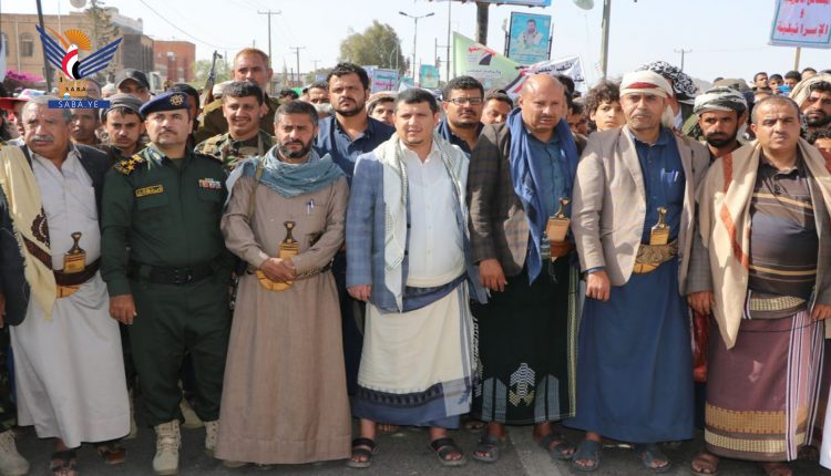 وخلال المسيرة، أكد محافظ ذمار محمد ناصر البخيتي، أن الشعب اليمني بصموده وثباته في مواجهة العدوان الأمريكي السعودي الإماراتي سجل أنصع مواقف الصمود والاستبسال في مواجهة قوى الغطرسة والهيمنة.