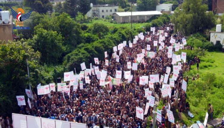 وأكد بيان صادر عن المسيرة تلاه محمد الحميدي، تمسك الشعب اليمني بالموقف المبدئي تجاه قضايا الأمة وفي مقدمتها القضية الفلسطينية.