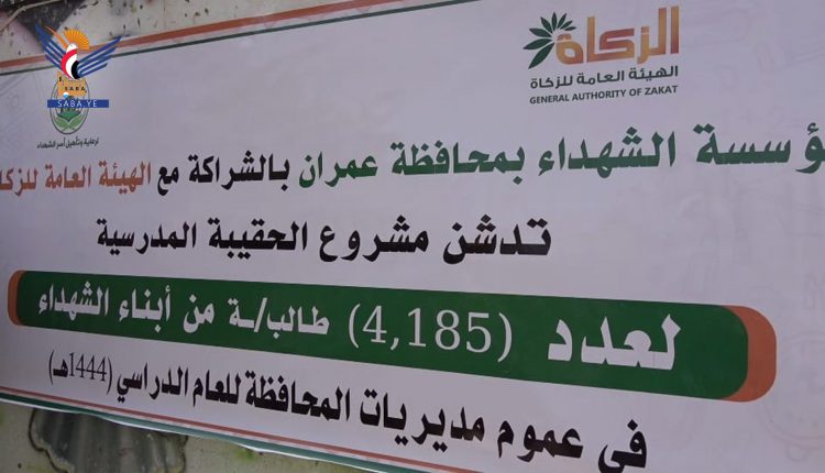 الصمود | دشن فرعا مؤسسة الشهداء والهيئة العامة للزكاة بمحافظة عمران اليوم، مشروع توزيع الحقيبة المدرسية لأبناء الشهداء.