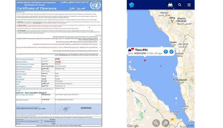 وأرفق المتوكل مع البيان نسخة من تصريح الأمم المتحدة لسفينة الديزل (تيارا) التي خضعت للتفتيش في جيبوتي بموجب آليات الأمم المتحدة، وكذلك تصريح السماح الأممي للسفينة بدخول ميناء الحديدة.