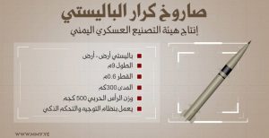 وصاروخ “كرار” الباليستي، هو صاروخ جديد (أرض – أرض)، أنتج من قبل هيئة التصنيع الحربي اليمنية ودخل الخدمة مؤخراً، متوسط المدى يعمل بالوقود الصلب يتميز بدقته العالية، ويبلغ طوله 9 أمتار وقطر 0.6 متر بينما يصل مداه 300 كم أما وزن الرأس الحربي 500 كجم ويعمل بنظام التوجيه والتحكم الذكي، وسيكون له دور حاسم في الحرب.