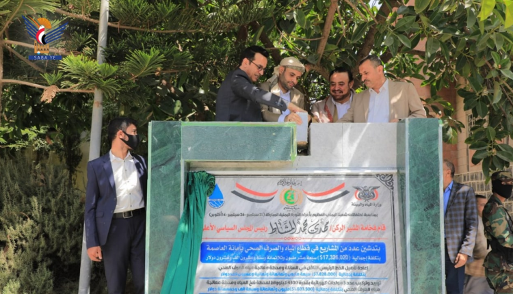 حيث وضع الرئيس المشاط ومعه وزير المياه والبيئة المهندس عبدالرقيب الشرماني، وأمين العاصمة حمود عباد ونائب وزير المياه حنين الدريب، حجر الأساس لمشروع إعادة وتأهيل الخط الرئيسي الناقل في السائلة ومحطة معالجة مياه الصرف الصحي.