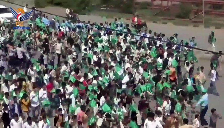 وردد الطلاب، خلال المسيرتين اللتين تقدمها مدير مكتب التربية في المحافظة عبدالجليل السامعي وأعضاء لجنة الحشد المركزية ورؤساء الشعب ومدراء الإدارات التربوية، الأناشيد المحمدية، والشعارات المعبّرة عن الولاء والطاعة والمحبة لله ورسوله.