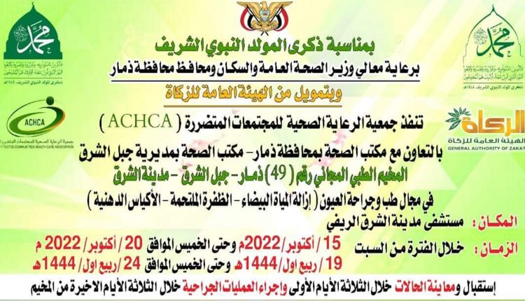 الصمود  | تدشن جمعية الرعاية الصحية للمجتمعات المتضررة، السبت القادم، بالتنسيق مع وزارة الصحة العامة والسكان، المخيم المجاني الـ49 لطب وجراحة العيون بمديرية مدينة الشرق في محافظة ذمار بتمويل من الهيئة العامة للزكاة.