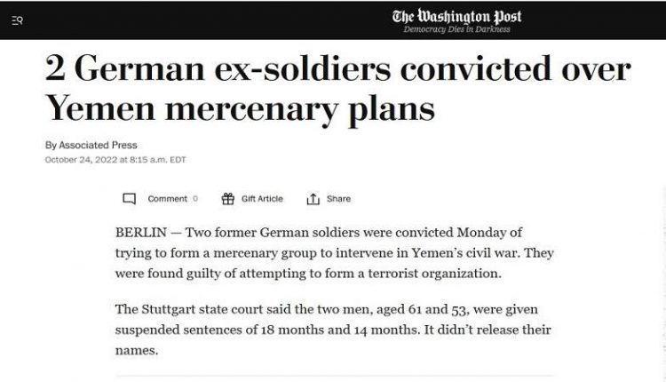 أدانت محكمة ألمانية، اليوم الاثنين، جنديين ألمانيين سابقين بمحاولة تشكيل مجموعة مرتزقة للمشاركة في الحرب على اليمن.