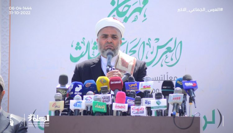 وقال مفتي الديار اليمنية في كلمة له في العرس الجماعي الثالث والأكبر في المنطقة، الذي نظّمته الهيئة العامة للزكاة، لعشرة آلاف و44 عريساً وعروساً: لقد أثبتت التجربة أن الناس يسعون في ذلك، وإنهم سيتمكنون من الحد من المغالاة في المهور، كما سيتمكنون من قضاء حوائج الناس، سيما والأمة تمر بما يسمى بالحرب الناعمة، التي يستخدم العدو فيها كل وسائله من أجل إغواء الناس وحرفهم عن مسارهم دينهم وسنة النبي الكريم – صلى الله عليه وآله وسلم”.